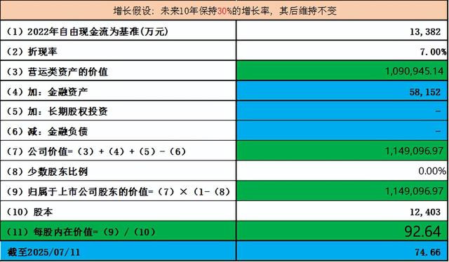 对于中科磁业,我们以2022年自由现金流为基数, 综合过往的营收和自由现金流增长情况, 假设未来10年复合增长率为35%, 估值如下: