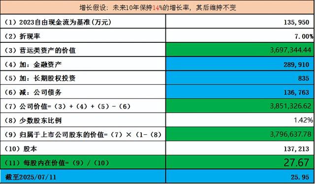 对于金力永磁,我们以2023年自由现金流为基数, 综合过往的营收和自由现金流增长情况, 假设未来10年复合增长率为14%,, 估值如下: